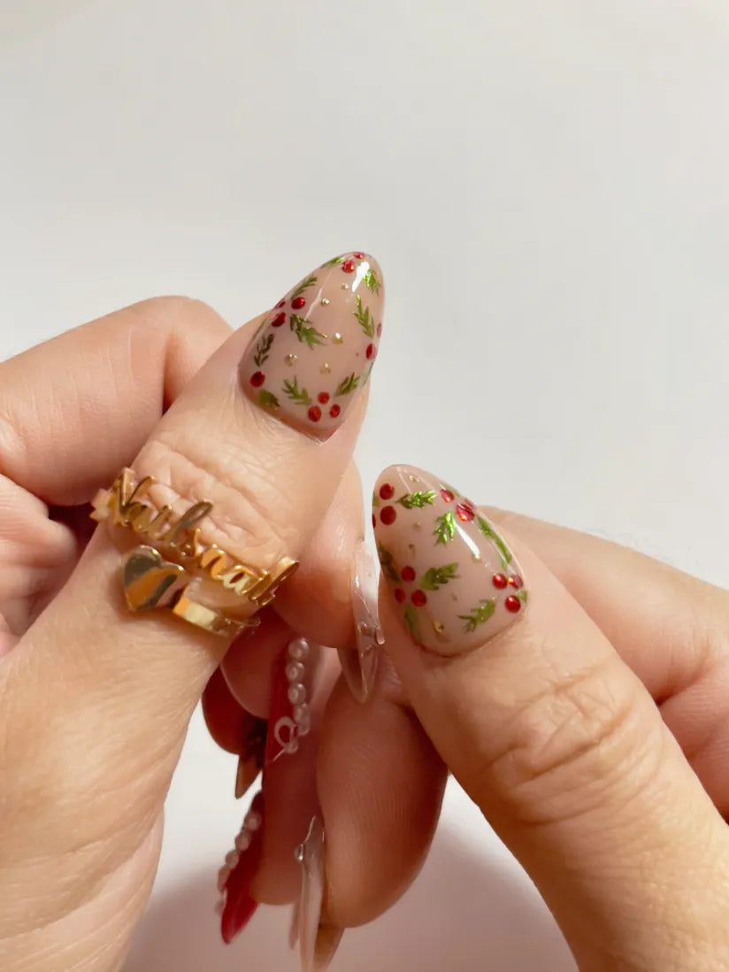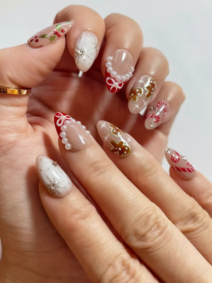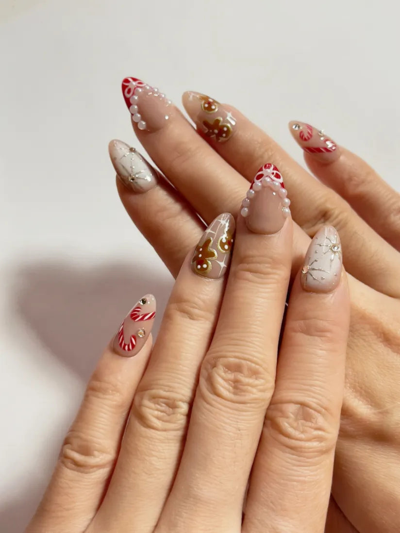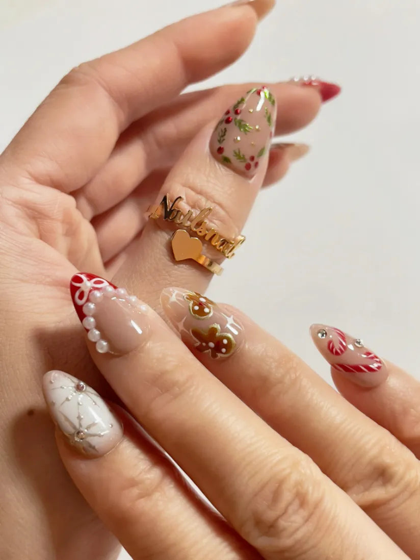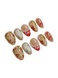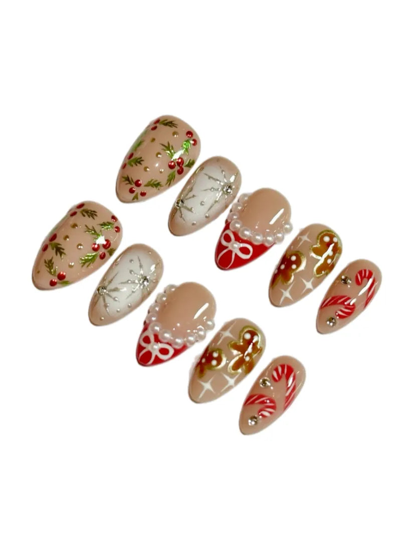 Candy Xmas is inspired by the sweetness of holiday candy shops and the playful charm of peppermint stripes. The design blends bright red and crisp white, adding delicate sparkle to capture the warmth and joy of Christmas. Each detail enhances the festive mood, making these nails ideal for holiday gatherings, gift exchanges, or seasonal photos. Wear them with cozy knits or Christmas accessories for an instantly cheerful, spirited look.