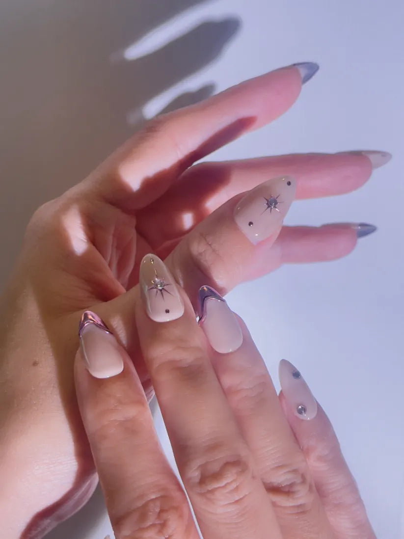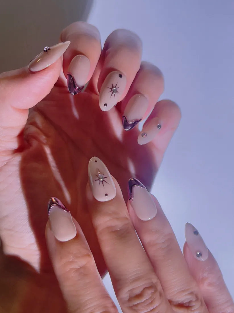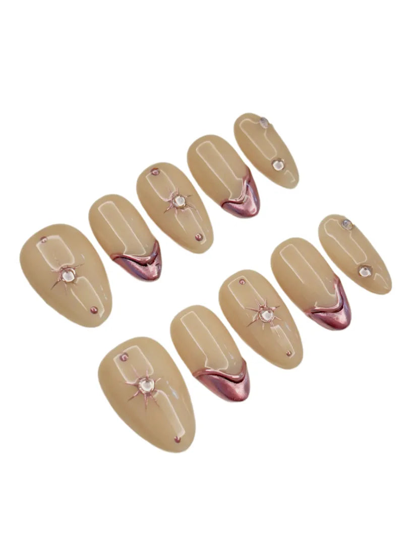 Celestial Rose redefines minimal chic with a nude base and rose pink chrome French waves. Adorned with delicate six-point star accents and soft pink crystals, this design blends simplicity with modern elegance. A versatile style that transitions effortlessly from everyday wear to glamorous nights.
