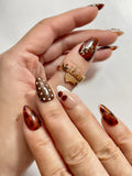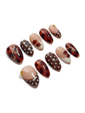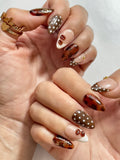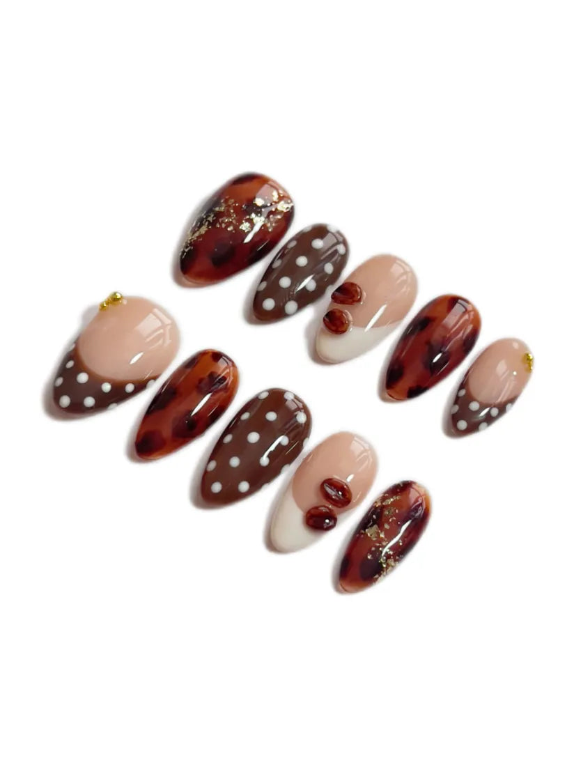 Indulge in the warmth of Coffee Dots, a coffee-inspired press-on nail set blending brown and white polka dots with elegant French tips. Gold bead accents, amber-like marble with gold foil, and 3D coffee bean details add a luxurious touch. Perfect for those who adore earthy tones, cosy aesthetics, and café-chic sophistication in every gesture.