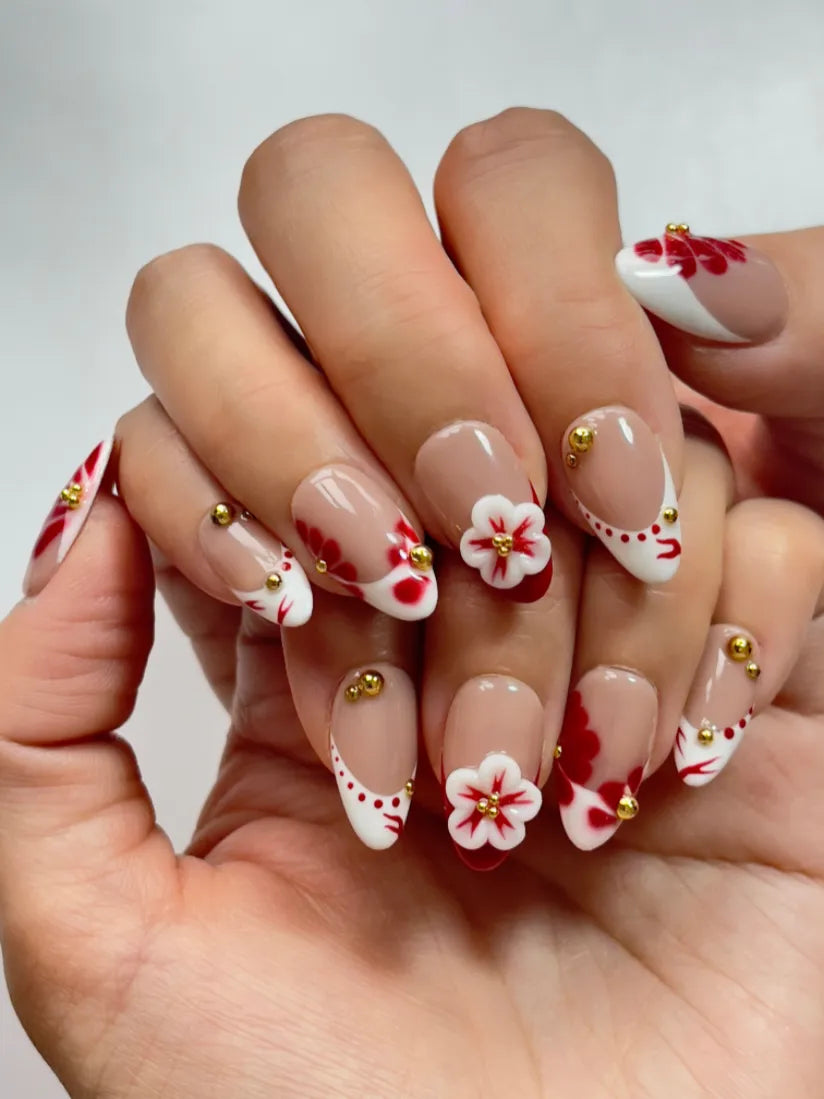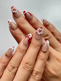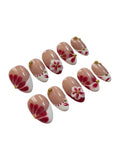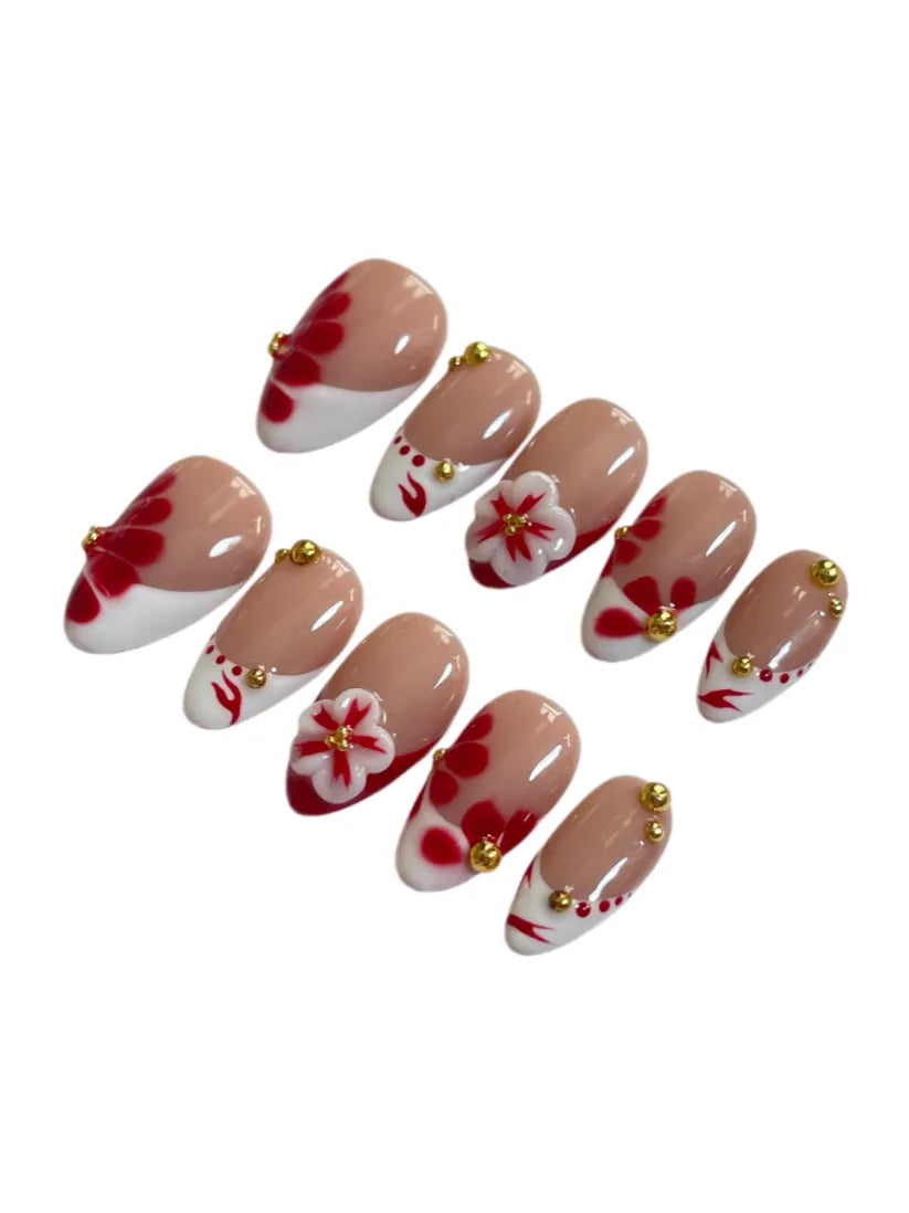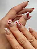 Inspired by autumn’s elegance, the Burgundy Bloom set combines deep wine-red petal lines with crisp white French tips. Each nail is hand-painted with delicate burgundy strokes, adorned with golden beads and white blossoms featuring rich red centers. This design captures the warmth and sophistication of the season — perfect for adding a refined floral touch to your autumn and winter style.