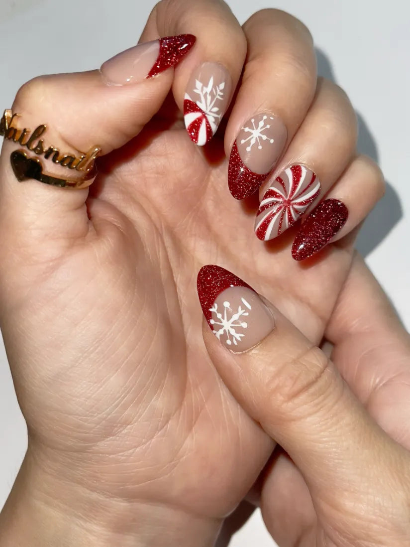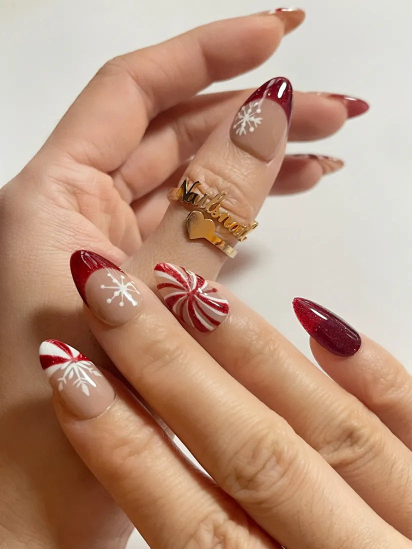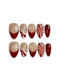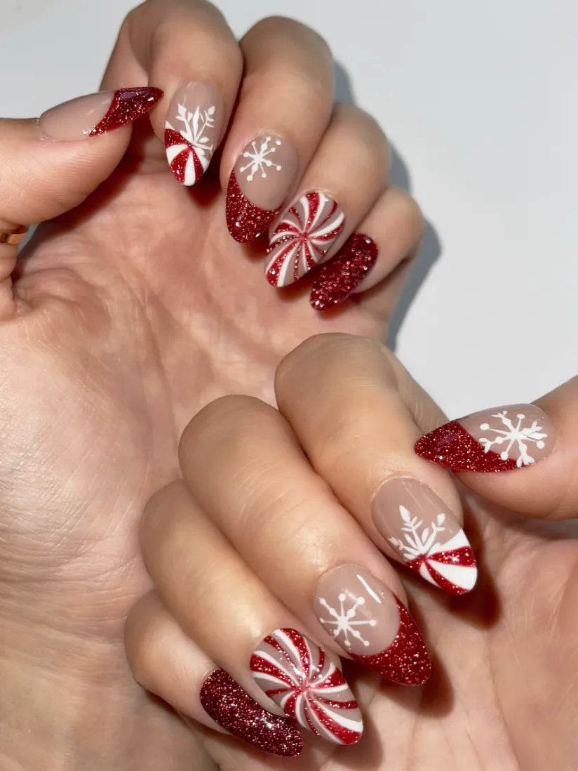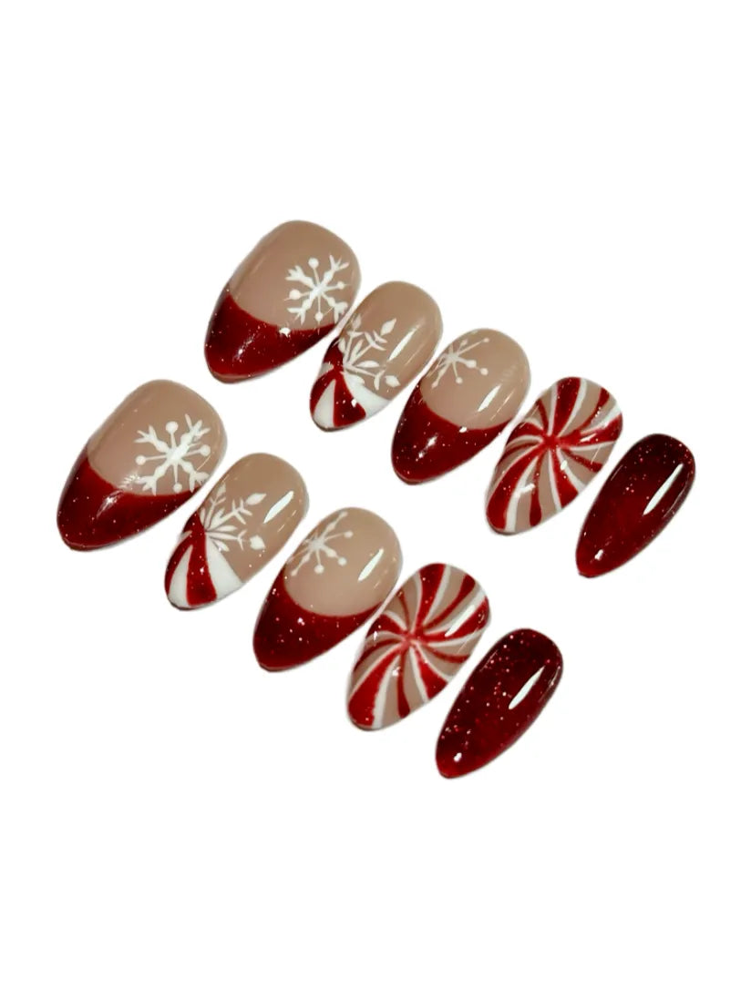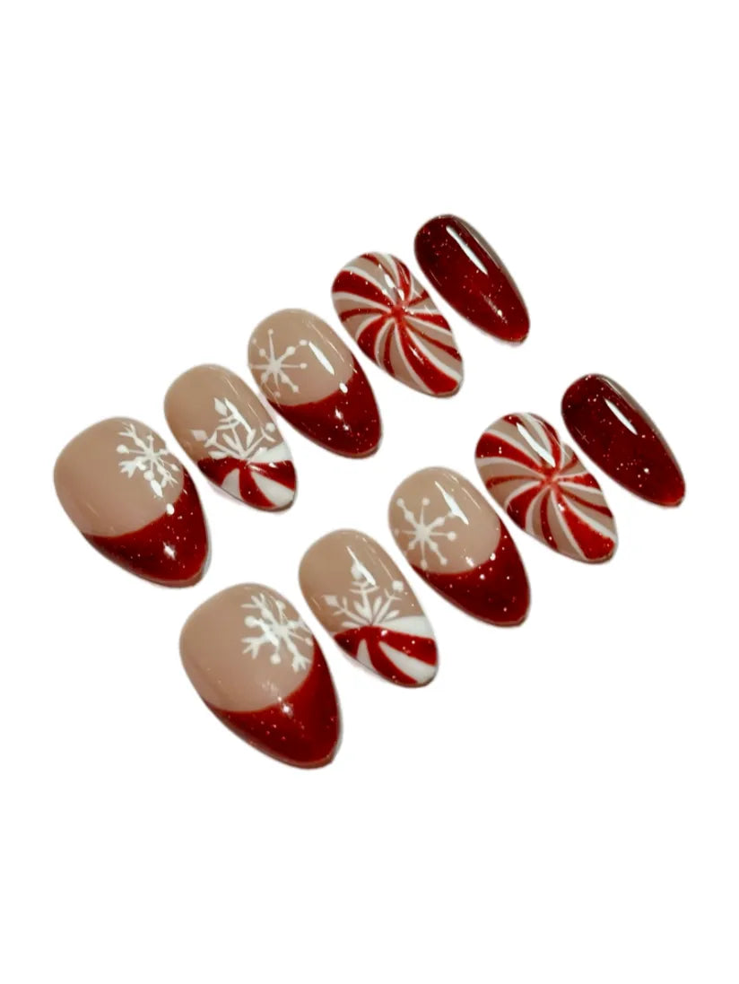 Red Peppermint brings the playful spirit of holiday treats to your fingertips. Its bold red-white swirl patterns create an energizing, cheerful vibe that instantly sparks festive joy. Accented with subtle shimmer, the design balances sweetness with modern brightness. Perfect for Christmas dates, winter markets, or casual holiday looks, these nails stand out in photos and add a fun seasonal twist to every gesture.